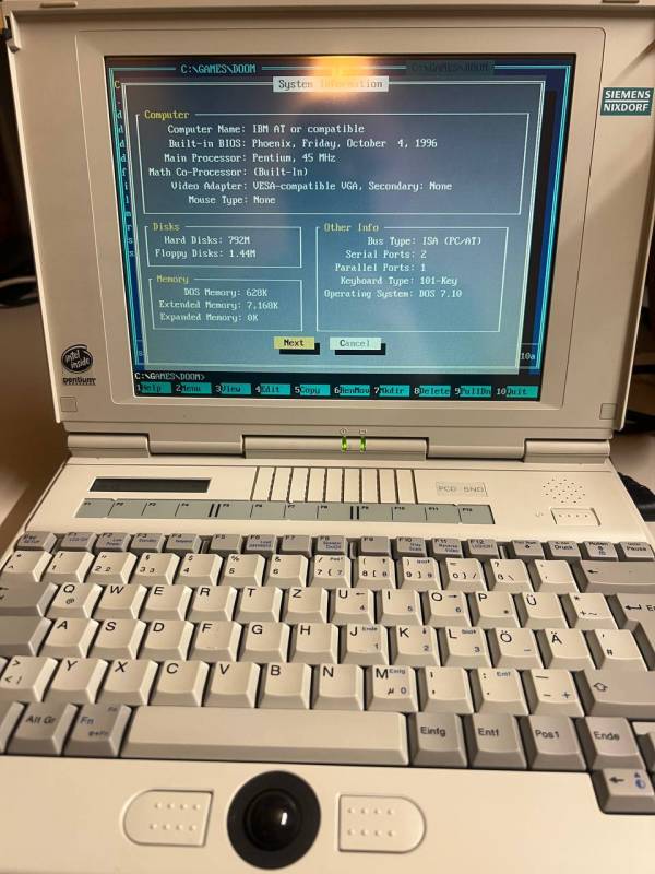 - 2026.02.26 → Arrived. The overall condition is very nice. It’s 30 years old but looks only slightly used, except for the additional RAM and its cover, as the HDD cover is missing. It came without an HDD, but it has a standard PATA IDE connector, so I added an 800 MB HDD and it works nicely. Don't know why it shows like running 45 Mhz because Bios shows 90 Mhz, will check it later. Also recently noticed that additional ram slots are damaged in the way it can't be repaired.